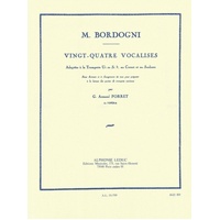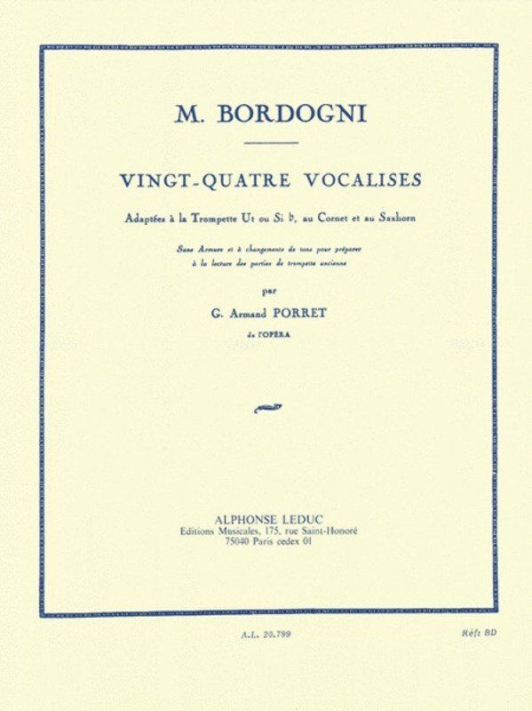 Italian operatic tenor, Marco Bordogni (1789-1856) received great success as a singer and teacher when he moved to Paris. His Vingt-Quatre Vocalises have remained popular, so much so that G. Armand Porret saw the need to adapt the studies for brass instruments. In Porret 's arrangement, which is adjustable to C or B? Trumpet, Cornet and Saxhorn, a handy transposition table is included. The Vingt-Quatre Vocalises enable the performer to focus on tone, lyricism, articulation, dynamic contrast, fingering and breath control, among other significant aspects. Being notably versatile, and having remained a popular aid to vocalists and instrumentalists for over two centuries, it isclear that Vingt-Quatre Vocalises , adapted for C or B? Trumpet, Cornet and Saxhorn, would be a crucial aid to a performer's progression. 24 Vocalises Trumpet Solos Book Composer: Giovanni Marco Bordogni Publisher: Alphonse Leduc Instrument: Trumpet
