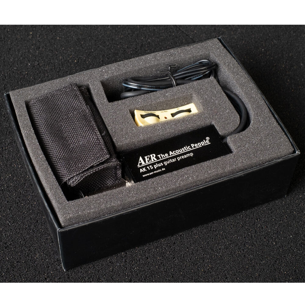 The AK15 plus is a two source system, the undersaddle piezo crystal pickup is combined with an electret condenser microphone integrated in the endpin pre-amp. It has been a developing goal to come up with an easy to use, versatile pickup system that captures the true sound of the instrument with a maximum of dynamic range, even if it exceeds the dynamic range of the instrument. The AK15 plus provides high volumes and impressive punch combined with low noise components for best possible signal to noise ratio.The AK15 plus system can be used with all guitars (steelstring and classic) which allow under saddle pick-up installation with string spacings from 10 to 12.5 mm. The installation is similar to all under-saddle pickup systems. The instrument does not suffer mechanical stress in use or during installation. There is no soldering necessary. Specifications: Max input: +10 dBV (Piezo) Max. Gain: 20 dbV Max Output +10 dB Output impedance: < 50 ohm Noise: < -91 dBV (22 Hz - 22 kHz, Gain= 0 dBV input shorted Supply voltage: 9V battery Supply current: 5.8 mA Design: Low Noise Class A/B, output stage Low Noise FET, input stage Package Contents: 1 x AK15 plus piezo pick-up with 2.5 mm jack 1 x AK15 plus endpin preamp with  integrated microphone, soundhole  control (SHC) and battery with pouch 1 x 9V battery 1 x Dual-lock (tape) for battery pouch 1 x adhesive tape for SHC 3 x Cable clamps Battery pouch with tape