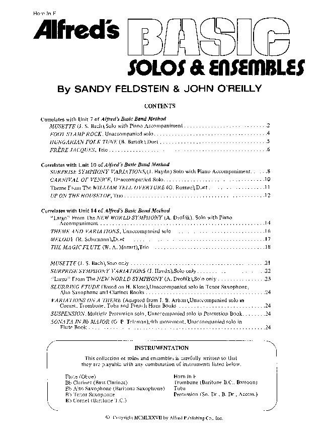 A collection of solos, duets and trios that correlates exactly with Units 7, 10 and 14 of Alfred's Basic Band Method. Contains music and mini-bios of the masters and are playable by any combination of instruments. Perfect for sectional rehearsals, or just for fun. Alfred's Basic Solos & Ensembles Book 1 Horn in F Composer: John O'Reilly|Sandy Feldstein Publisher: Alfred Music Instrument: Horn Pages: 24 Series: Alfred's Basic Band Method