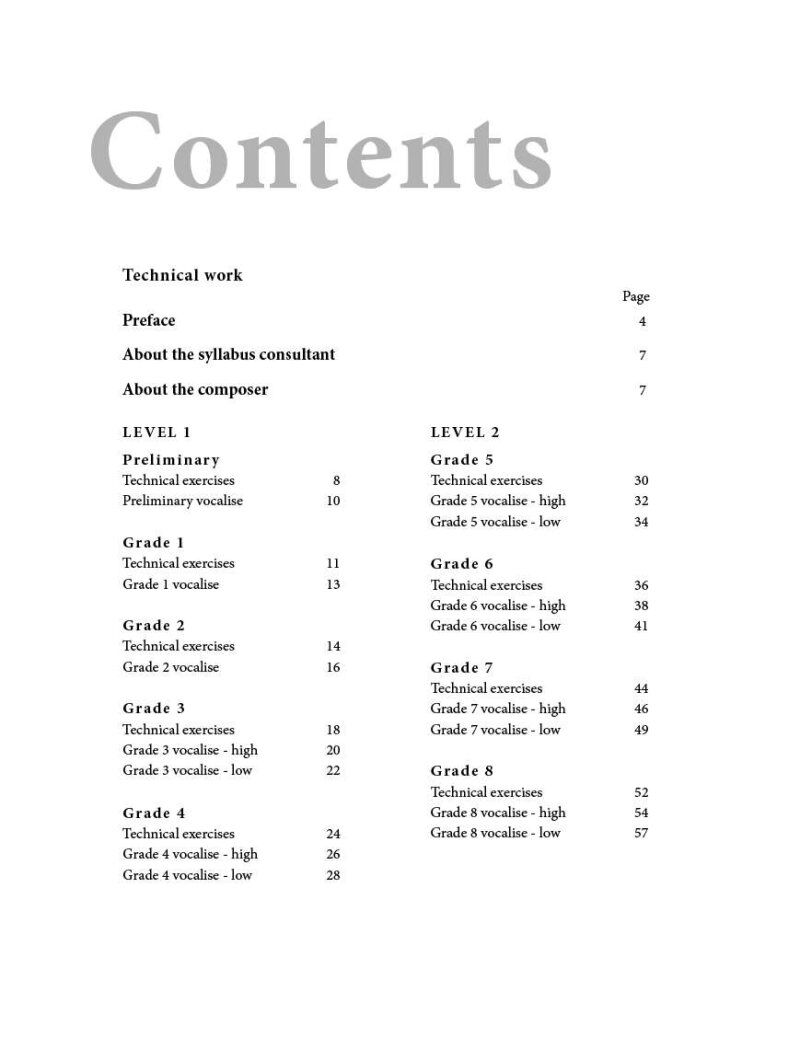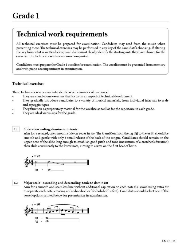 Collection of graded vocalises and exercises that make up the technical work requirements for AMEB Musical Theatre examinations from Preliminary to Grade 8. The custom-composed vocalises and exercises focus on developing a range of appropriate vocal techn