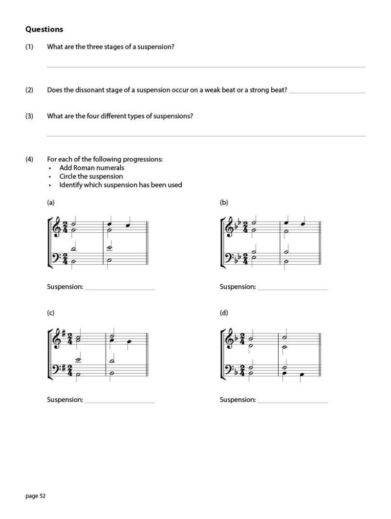 • Lessons 1 to 6 focus on the new harmony for the grade, including chord III, the dominant 7th chord, second inversion triads, suspensions, accented passing and auxiliary notes, and modulation.