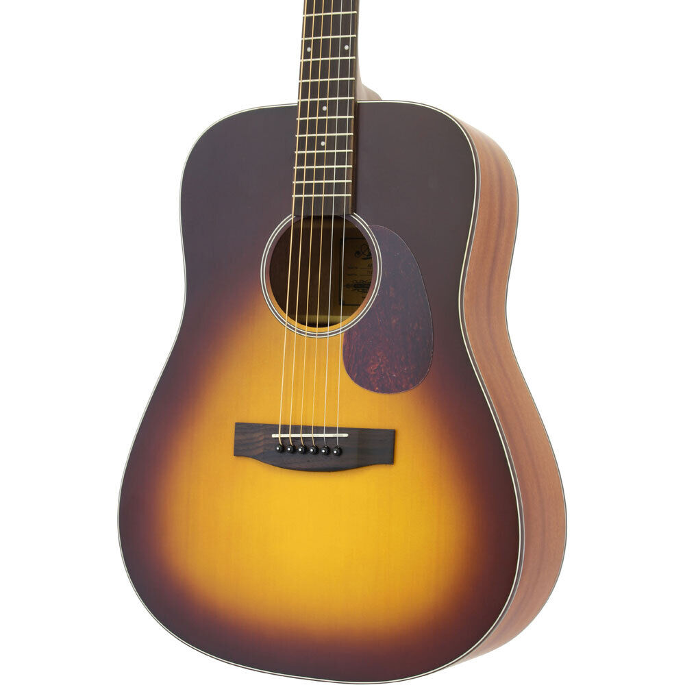 Aria "100 series" offer great affordability while keeping a perfect playability and rich clear projection. This Dreadnought body shape is extremely popular with players looking for a guitar that offers a nice full tone. It features a Spruce top with Sapel