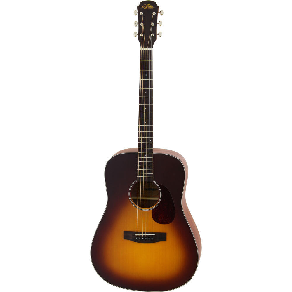 Aria "100 series" offer great affordability while keeping a perfect playability and rich clear projection. This Dreadnought body shape is extremely popular with players looking for a guitar that offers a nice full tone. It features a Spruce top with Sapele back & sides finished in a beautiful Tobacco Sunburst Matte finish with a shell pickguard. All in all a well made guiitar at a great price. The History of Aria Guitars (Arai & Co., Inc.) "It all started with the classical guitar", says Shiro Arai, Chairman and the founder of Aria Guitars. One day, a friend came to visit Shiro's apartment with a guitar. Shiro was expecting to hear Koga-type Japanese po pular music, but instead his friend started to play a piece by Bach. From this moment, he had been inspired by the sound of this instrument forever. The very next day, Shiro bought his first guitar, costing over two months salary and began to teach himself to play. Now playing day and night, his passion for the guitar brought him to a famous classical guitar master in Nagoya, and soon became one of his students. Shiro started work for a trading company in 1947, aged 17. In 1953, Shiro and two of his colleagues resigned their positions and founded their own trading firm. After the fledgling company failed after just one year Shiro found himself homeless with nothing but his guitar. In order to live and settle the outstanding debts from this first business he started to teach the guitar. In 1954 unable to buy guitars, music and strings in Japan's music stores, Shiro started to import classical guitars, Augustine guitar strings, and musical scores for himself and his students. These were the first classical guitars imported into post-war Japan and included instruments from renowned makers Jose Ramirez and Hermann Hauser. Recognising an incre asing demand for guitars from friends and players throughout Japan, Shiro grasped the opportunity to start his own business. On August 2nd, 1956, ARAI & CO., INC was founded. At this time, although demand for classical guitars and accessories were increasing, it was still comparatively low and business was supplemented with other products including woollen material. The name, "ARIA" which means expressive melody, was first used in 1958 when Arai exported Japanese built classical guitars fitted with steel strings to South East Asia in 1963. Also the letters of his name "ARAI" were just switched around to "ARIA as he recalled. Shiro embarked on a tour of the US with two of the best Japanese KOHNO guitars. At that time Japanese guitars had a poor reputation for developing body cracks and warped necks after being exposed to drier conditions abroad. It was Shiro's intention to prove how good Japanese guitars were by performing and showing to fellow guitarists, teachers and music shops. After two months these guitars also started to crack. Even the best available Kohno guitars faced the same problem. Shiro took these cracked guitars back to Japan to show their makers just how vital it is to use properly seasoned tone woods. This trip gave Shiro the experience and knowledge to improve the quality of guitars and export Japanese guitars worldwide. It was as early as the late 50's when Arai started to import Fender guitars and amplifiers from the US, although at that time the Japanese market was not quite ready for the electric guitar! With the advent of rock n' roll demand for electric guitars took-off. Arai released its first ARIA brand electric guitars in early 60s and soon after started to export to the US followed with models including the 1532T and 1802T. To counter the decline of the solid body electric guitar boom, Arai released the Aria Diamond series hollow body semi-acoustic guitars. Aria Diamond was named after the imitation diamond inlayed into the headstock. This series lead to the release of the 1202 models in 1966 and caused nothing short of a sensation in Japan. From 1967 Aria added a variety of models including the solid body 1702T, R-320, and violin shaped 12-string and bass guitars, and a full acoustic guitar. In 1975, Aria Pro II was developed from Aria's custom shop making high-end models for professional users. In 1976, Aria Pro II released its first original model, the PE-1500. PE (Prototype Line) is a classic Aria design, also known as the legendary masterpiece, it featured an arched top, and all maple carved body with Aria's original "heel-less neck and DiMarzio Super Distortion Humbucking Pickups. Primarily designed for tone and playability, the PE series has been modified to match today's trends while keeping its original features and timeless design. In 1978, Aria Pro II released another long-selling model, the SB-1000. The SB-1000 was highly regarded throughout the world and came to represent everything that was good about Aria and Japanese guitar building. Featuring a Canadian Ash body with neck through body and, to enhance playability, a heel-less neck. For its original tone, SB featured the Aria original BB circuit. Its exotic see-through finish and the eye position marks make the SB amongst the most distinctive basses ever made. Aria Pro II led the way with the 80's shift to Hard Rock and Heavy Metal. Releasing many models such as XX, ZZ and U-1. Whilst not abandoning their routes also re-established the semi-acoustic guitar models, FA and TA. The 80s, also saw the introduction of the famous IGB (SB INTEGRA) bass series. In the early 1990s, after the heavy metal rush, Aria Pro II released one of its favourite original models, the MA series to reinforce the PE and SB line-ups. MA series bodies are constructed with innovative crystal shaped carved top and back. Continuing its remarkable progress, Aria released the very unique concept of the SWB (electric upright bass) series to the world in 1992. The SWB range offers compact modern design and features the Fishman custom bridge Piezo pickup and active tone circuit. Aria has been at the forefront of guitar and Japanese guitar building