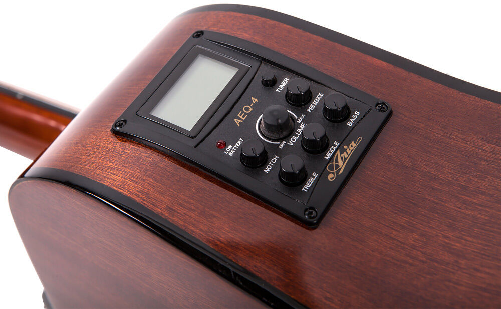 Aria ADW-01CE is an ideal guitar for beginners of various styles and genres. The body built with a Spruce top and Sapelli back and sides generates clear projection and genuine acoustic sound. Aria original preamp AEQ-4 enables you to create various tone c