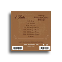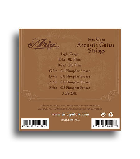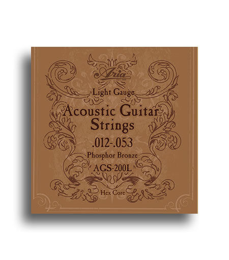 Aria acoustic guitar stings. Phosphor bronze wound with hexagonal core. Light Gauge E-1st .012 Plain Steel B-2nd .016 Plain Steel G-3rd .024 Plain Steel D-4th .032 Phosphor Bronze A-5th .042 Phosphor Bronze E-6th .053 Phosphor Bronze
