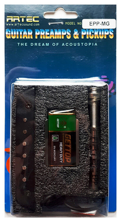 Artec EPPMG Endpin Preamp System with Soundhole Pickup for Acoustic Instuments. ARTEC will help your ideal guitar sounds come true without paying too much money or changing your guitar! Pack Includes: Preamp output Jack MSP50 Soundhole Pickup Battery snap and cable Battery Mount with Velcro Battery: 9V Alkaline Endpin Preamp Specifications: Power: Battery DC-9V Current: 0.1mA Battery lifetime: 1500 hours Output Jack: Nickel Plated End pin Jack Input Impedance: 1 Mohm Output Impedance: 1 Kohm MSP50 Soundhole Pickup Specifications: 10mm Pole piece pitch Single bobbin Ceramic magnet Plastic cover Passive MSP 50 is a single coil passive soundhole magnetic pickup that enhances realism and smoothness in your guitar sound. It's slim design can avoid the soundhole obstruction that other soundhole pickup used to. You will not even realize that MSP 50 is sitting on your guitar until you hear the natural acoustic sounds coming out from your guitars. MSP 50 has been designed brilliantly to keep the miscellaneous parts all together. Mounting clamps are permanently attached to the main body with foam rubber covered slots to prevent damage to your guitars. MSP 50 features adjusted pole pieces and unique design of magnetic bar inside for precise string to string balance.