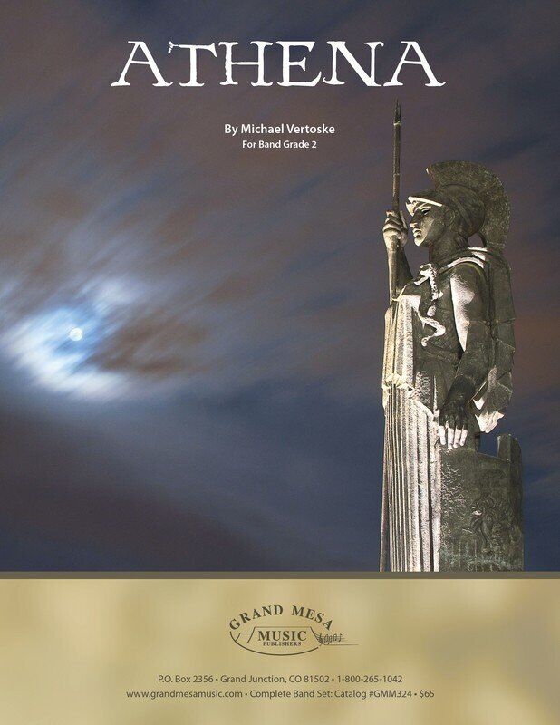 In Greek Mythology, Athena is the goddess of wisdom, courage, and inspiration, as well as the arts and literature. This composition honors Athena's mythological attributes and creates a dramatic musical representation of her many facets. Moments of power and strength are sharply contrasted with delicate, introspective passages, keeping in character with Athena's persona. Elevate your students' musicianship with this beautifully constructed tribute to Athena. Athena Composer: Michael Vertoske Publisher: Grand Mesa Music