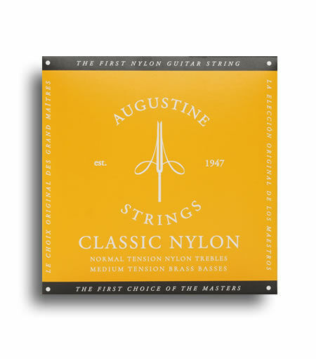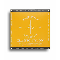 The only Augustine strings to deviate from the original silver winding that Albert perfected, Gold basses feature brass wire that imbues a flush, shimmering tone often preferred by flamenco and jazz players. Made in New York, USA. Augustine Classic Gold - Normal Tension Nylon Trebles / Medium Tension Brass Basses STRING NOTE DIAMETER (in) DIAMETER (mm) TENSION (lbs) TENSION (kgs) Classic Treble 1 E .028 .71 17.21 7.81 Classic Treble 2 B .032 .81 12.88 5.84 Classic Treble 3 G .040 1.01 12.25 5.56 Gold Bass 4 D .0315 .80 17.76 8.06 Gold Bass 5 A .035 .89 14.16 6.42 Gold Bass 6 E .0445 1.13 14.38 6.52 Augustine Strings' legacy of innovation began over 75 years ago when our founder, Albert Augustine, successfully created the first nylon guitar string at the request of legendary Spanish classical guitarist, Andrs Segovia. As the inventor and producer of the gold standard of nylon guitar strings, Augustine continues to advance the sonic possibilities of our instrument today with the introduction of the crystal nylon Imperial and Regal lines and the fluorocarbon Paragon sets - all strings of the highest quality, made in the USA, and designed to offer guitarists a full range of options to bring out the best sound and playability from their instrument.