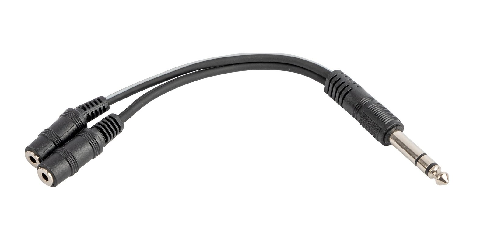 6.3 TRS (M) to dual 3.5 TRS (F) cable. Duplicates a stereo signal. For use as a headphone adaptor, adapting one headphone jack to two headphones.