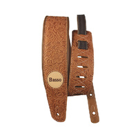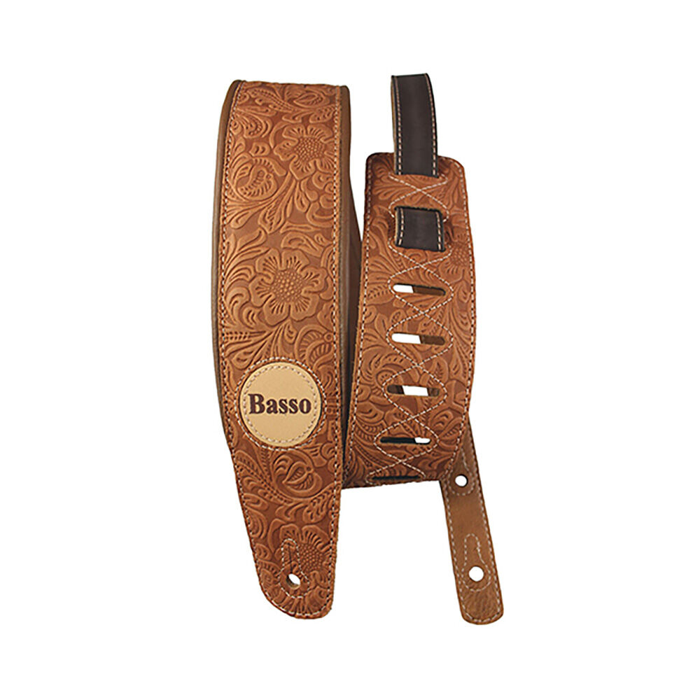 Basso Floral Leather Guitar Strap - Whiskey, 1.00-1.45m Adjustable Length, 7.5cm Width, Foam Padding, Reinforced Tip