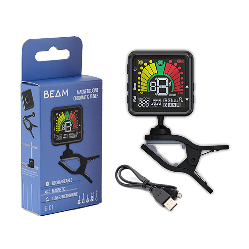 Large, bright colour display. Chromatic tuner suitable for: Guitar, Bass, Uke, Violin, Banjo. Metronome with 4 volume settings. Double swivel joints for maximum adjustment. Detachable head to sit on table or music stand for metronome function. Auto off feature to save battery power. Rechargeable via supplied USB cable.