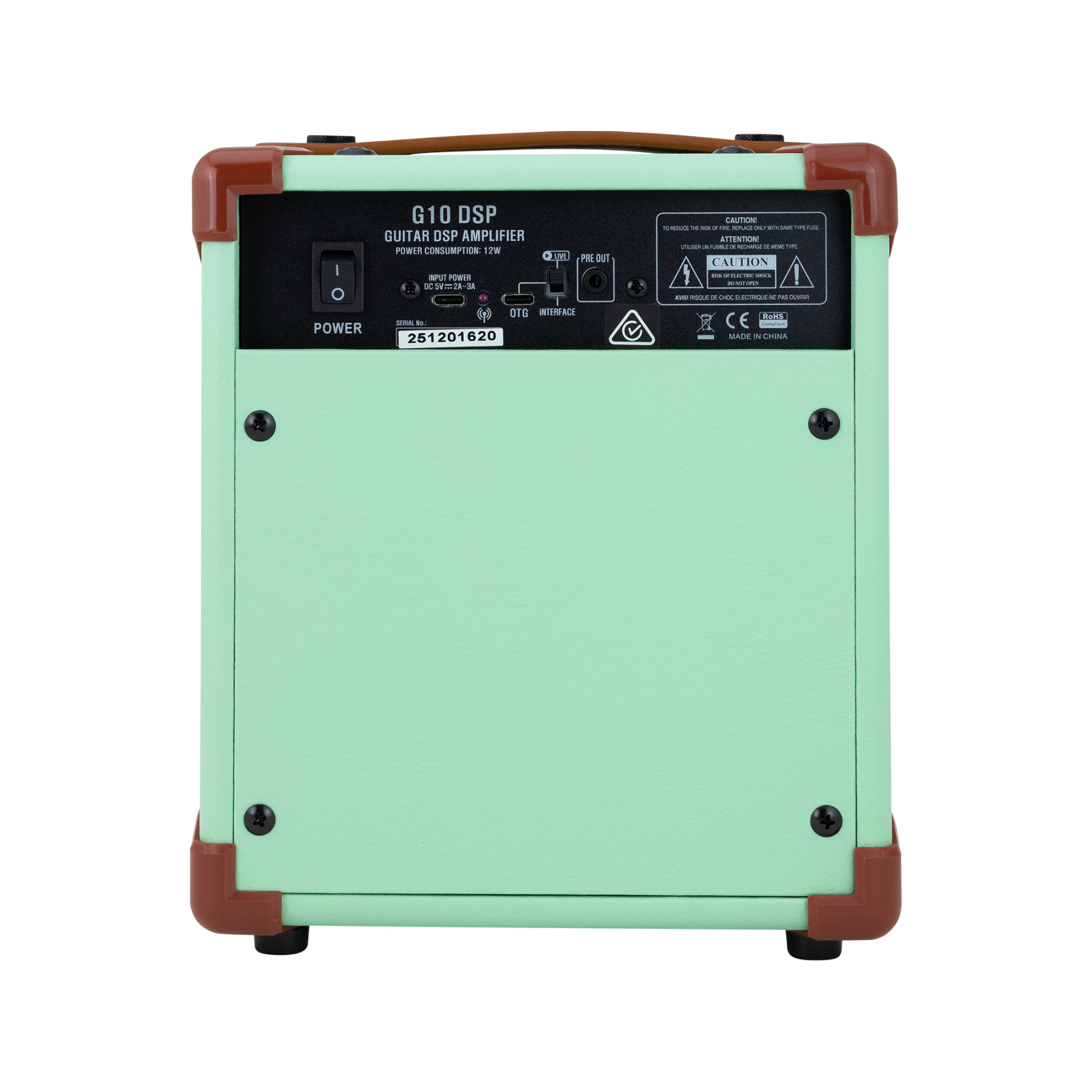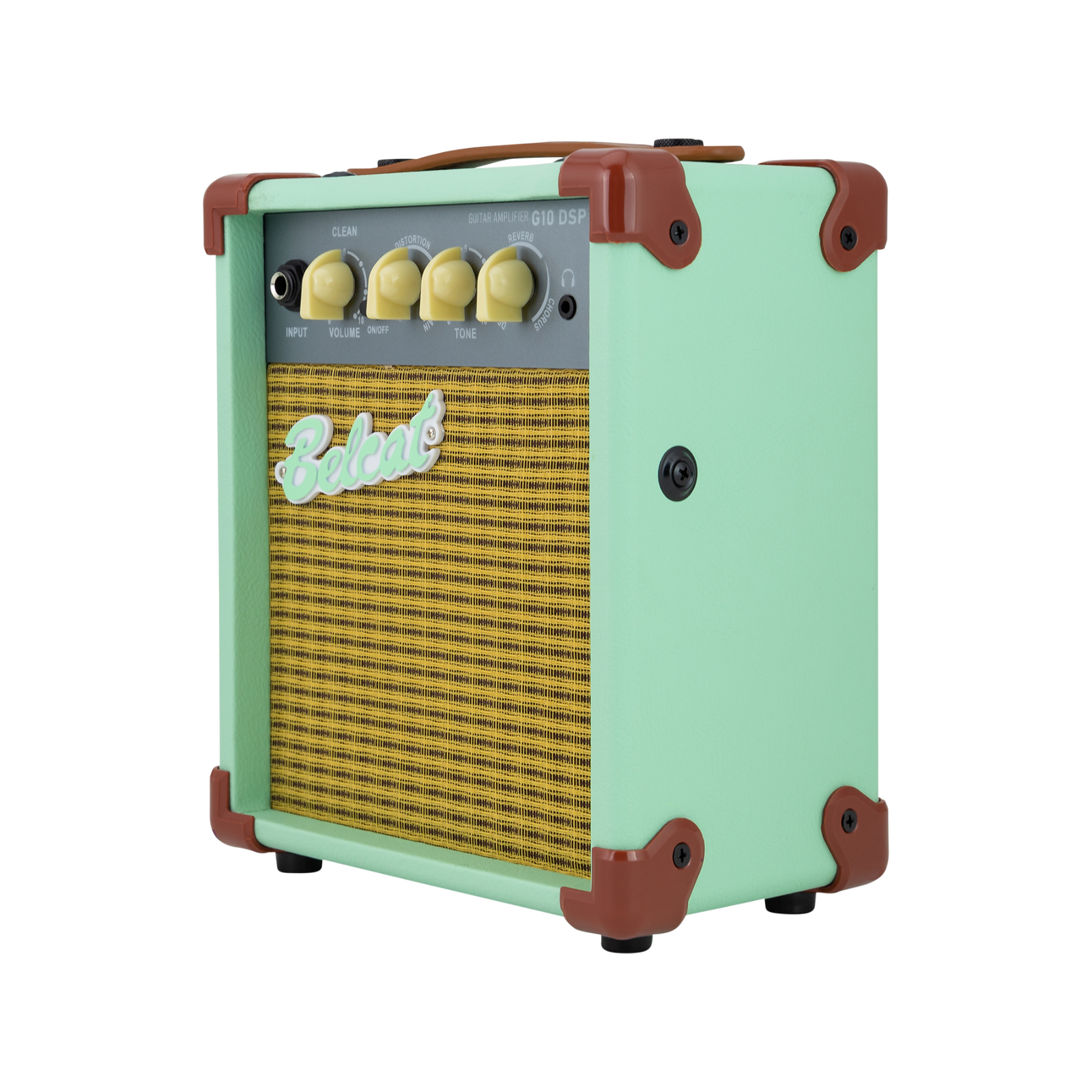 Compact and versatile, the Belcat G10 DSP Guitar Combo Amplifier delivers great tone for practice and recording. Featuring clean and overdrive channels, selectable Drive, Distortion and High Gain modes. Plus built-in Delay, Reverb and Chorus effects. The G10 can also be used as a Bluetooth speaker. Other features include USB-C output supporting 44.1kHz / 24-bit recording to computer or mobile. Along with headphone output and preamp output the G10 is a powerful all-in-one practice amp! Availible in Black, Mint Green and Biege Specifications Power Output: 10W Speaker: 5" 8 ohm Inputs: 1 × Guitar Input Outputs: 1 × Headphones, 1 × Preamp Out Bluetooth: Wireless audio streaming Recording: USB-C OTG, 44.1kHz / 24-bit recording Effects: Delay, Reverb, Chorus Gain Modes: Drive, Distortion, High Gain Controls: Clean Volume, Overdrive Switch, Gain Mode, Tone, Effects Selector Power Supply: DC 5V (2–3A) Dimensions: H: 23cm D: 12cm W: 20cm