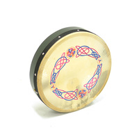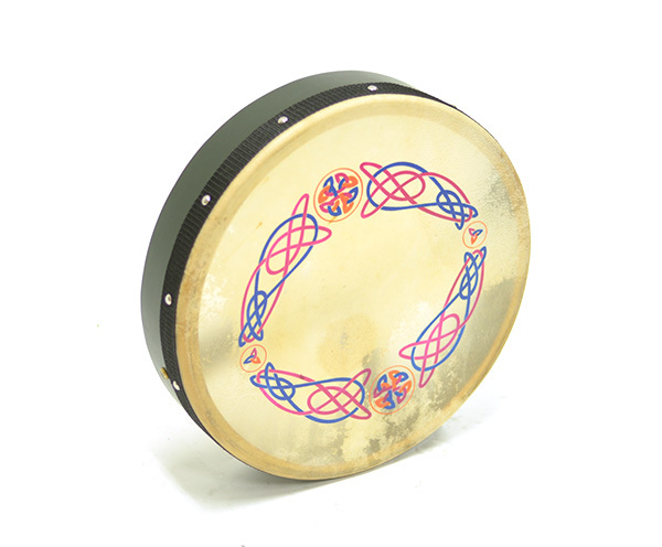 14" non-tunable Bodhran. Natural leather skin with "Knotwork" emblem. Made in Pakistan.