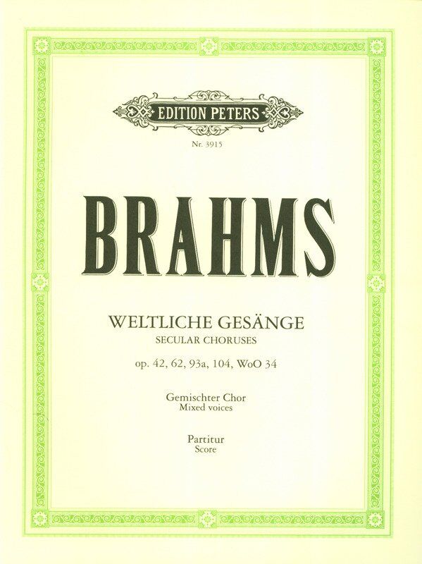 35 Secular Choruses Op. 42, 62, 93a, 104, WoO 34 Composer: Johannes Brahms Publisher: Edition Peters Instrument: Voice Format: Choral Score Pages: 1
