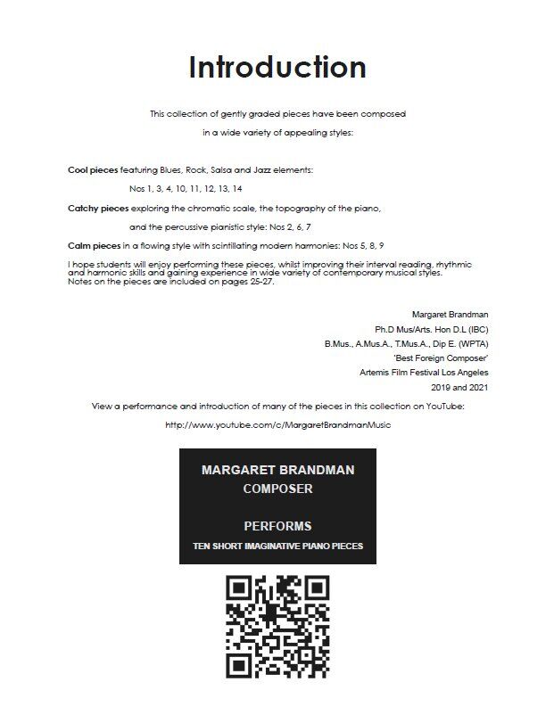 A collection of 14 Imaginative Piano Solos at an Early to Intermediate Level. Cool pieces featuring Blues, Rock, Salsa and Jazz elements. Catchy pieces exploring the chromatic scale, the topography of the piano, and the percussive pianistic style. Calm pieces in a flowing style with scintillating modern harmonies. Cool Catchy Calm Composer: Margaret Brandman Publisher: Jazzem Music Instrument: Piano Pages: 1