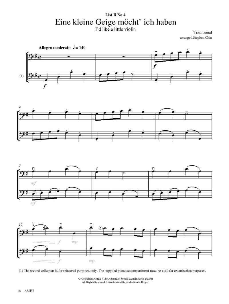 Collection of graded repertoire for AMEB Cello exams. Carefully selectedby top Australian Cello performers and pedagogues, the grade books feat ure a diversity of musical styles and often include works by celebrated Australian composers. Repertoire is car