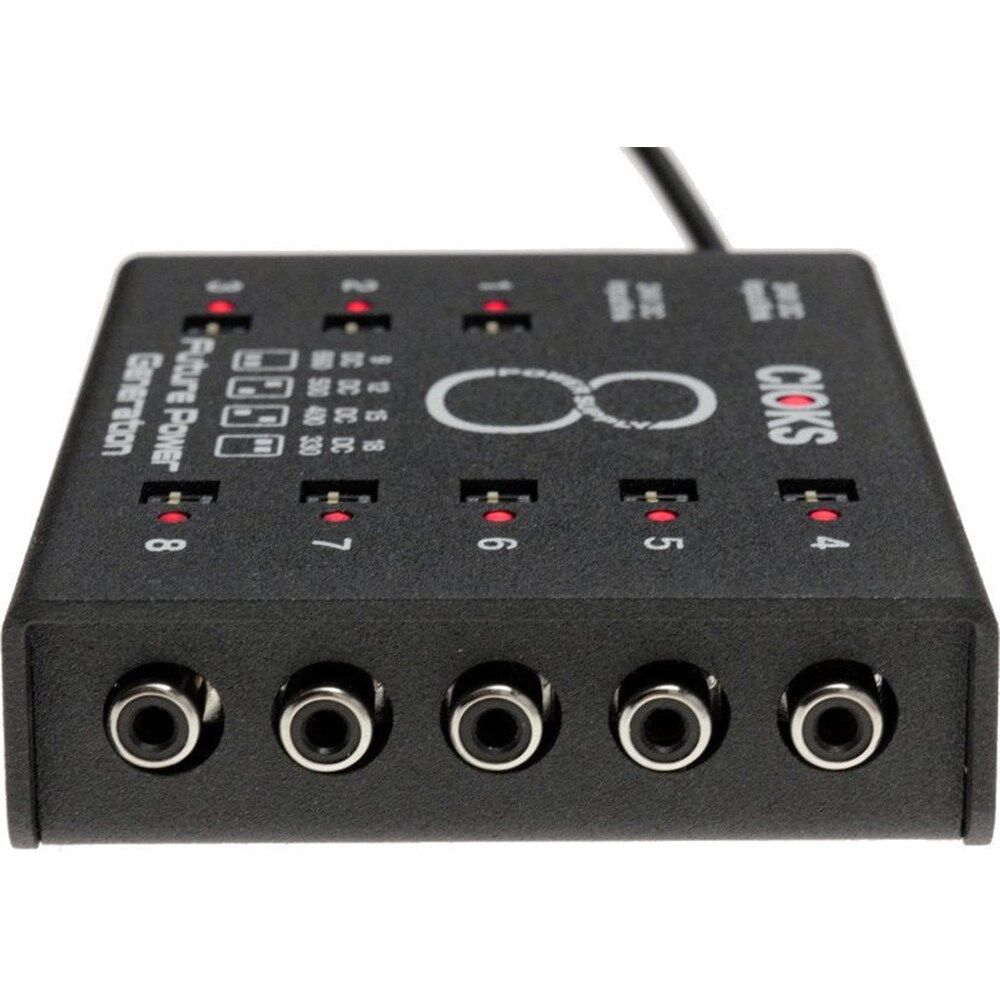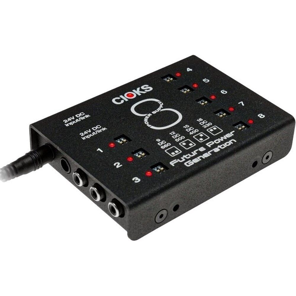 CIOKS 8 Expander Power Supplies CIOKS 8 Expander is our largest switch-mode power supply extender and it features 8 isolated outlets which each deliver 9V DC with 660mA. All eight outlets offer four selectable voltages (9V, 12V, 15V and 18V). Description CIOKS 8 is our largest switch-mode power supply extender and it features 8 isolated outlets which each deliver 9V DC with 660mA. All eight outlets offer four selectable voltages (9V, 12V, 15V and 18V). CIOKS 8 was primarily designed to be used as a large extension to DC7 in case you need more outlets. If you are looking for a super powerful power supply setup to power a large pedalboard, the combination of CIOKS DC7 and CIOKS 8 will definitely be an awesome solution as this combo will give you 15 isolated outlets in total with 4 switchable voltages on each outlet plus a 5V USB outlet to charge your smartphone or tablet (courtesy of DC7)*. CIOKS 8 Expander is also available with the DC7 and a large set of Flex cables included. This is called the Superpower Bundle and is widely available at retailers. Features CIOKS 8 has the same groundbreaking 1-inch profile (25,4mm) as CIOKS DC7 Ultra-low noise achieved by multistage filtering 8 isolated DC-outlets, 6W each 660mA at 9V DC on each outlet 4 selectable voltages on each outlet Global overload status LED Total maximum output power 48W Mounting hardware for Pedaltrain and Templeaudio boards included Compatible with CIOKS GRIP for drill-free mounting on Pedaltrain boards** 12 Flex cables included 24V DC Link cable included Designed in Denmark, assembled in Poland 5-year worldwide warranty * DC7 and C8e is also available as a combo called the CIOKS Superpower Bundle ** Sold separately Specifications Outlet 1-8: 9V DC / 660mA or 12V DC / 500mA or 15V DC / 400mA or 18V DC / 330mA each What's in the box CIOKS 8 power supply 12 Flex cables 50cm DC Link cable (to connect to CIOKS DC7) Mounting hardware (2 screws and a hex-key) Product sheet (drill guide) Flex and DC Link cable selection guide Sticker (sheet with 2pcs.) Manual