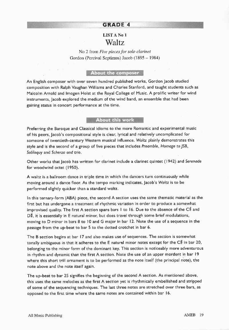 Contains a CD with recordings of all the repertoire that is contained in the corresponding grade book, as well as a booklet of performance notes and musical analyses with a glossary of key terms to help students address the Section III General Knowledge requirements of examinations. Clarinet Grade 3 & 4 Series 3 CD Recording & Handbook Publisher: AMEB Instrument: Clarinet Pages: 38 Series: 3
