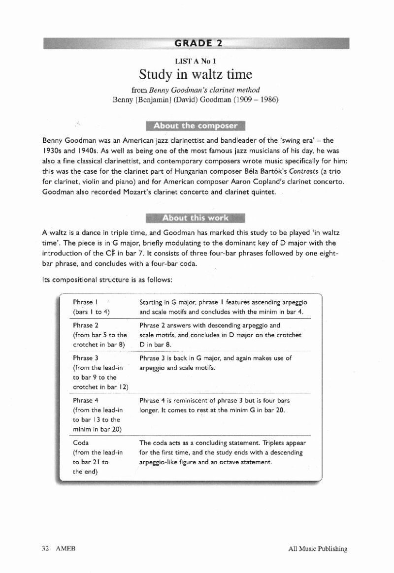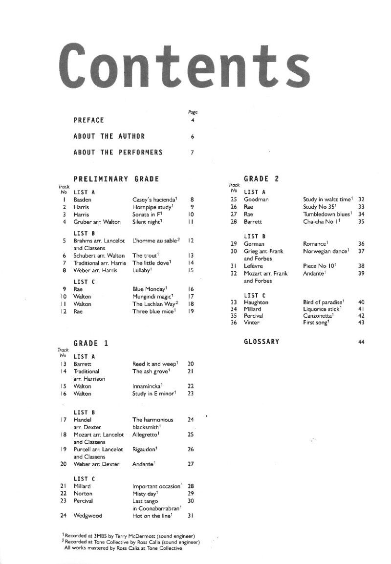 Contains a CD with recordings of all the repertoire that is contained in the corresponding grade book, as well as a booklet of performance notesand musical analyses with a glossary of key terms to help students addr ess the Section III General Knowledge requirements of examinations. Clarinet Preliminary- Grade 2 Series 3 CD Recording Handbook Publisher: AMEB Instrument: Clarinet Pages: 51 Series: 3