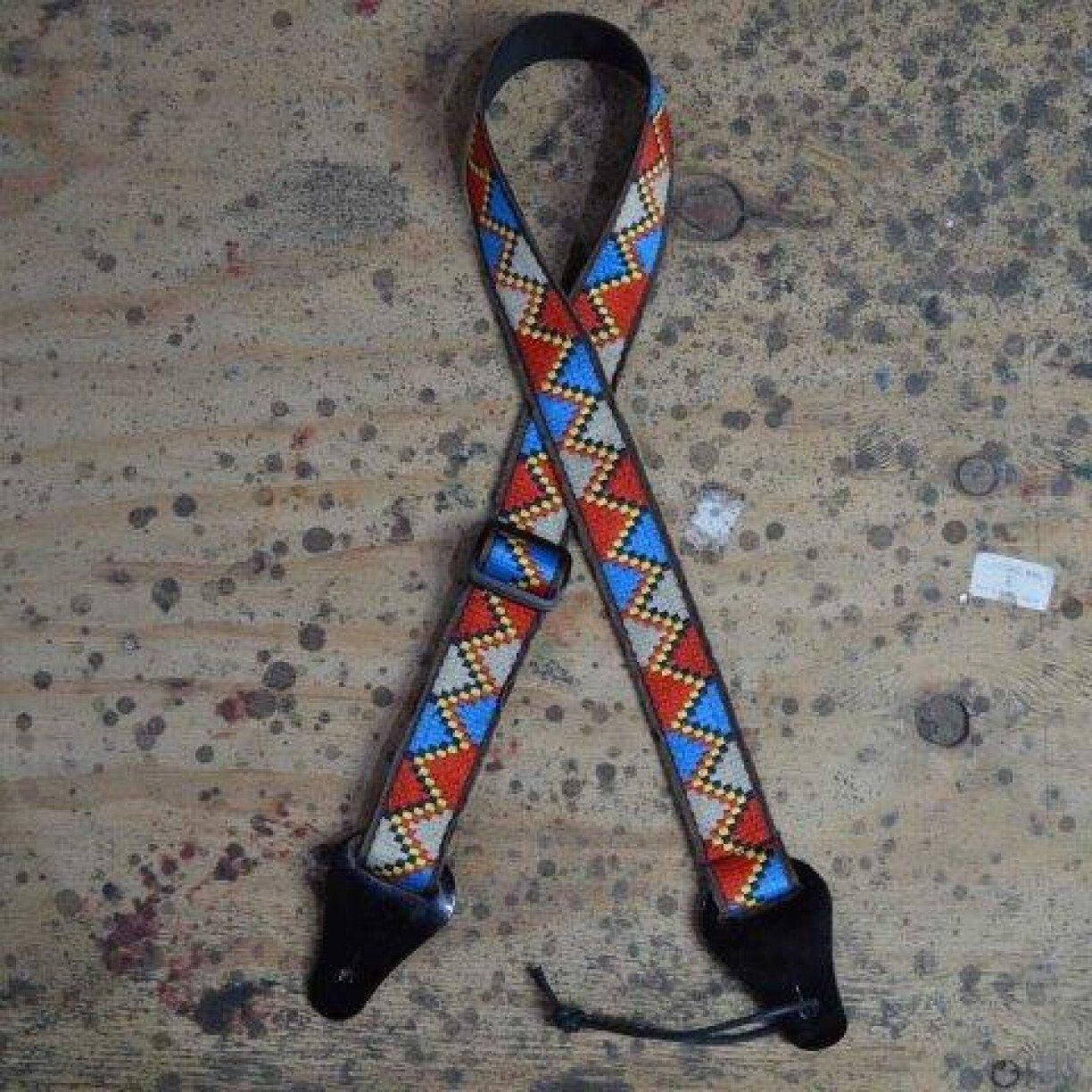 Jacquard sewn onto 40mm webbing ukulele strap 2mm genuine leather ends Slide adjustable in length from 80cm to 115cm Made in Australia