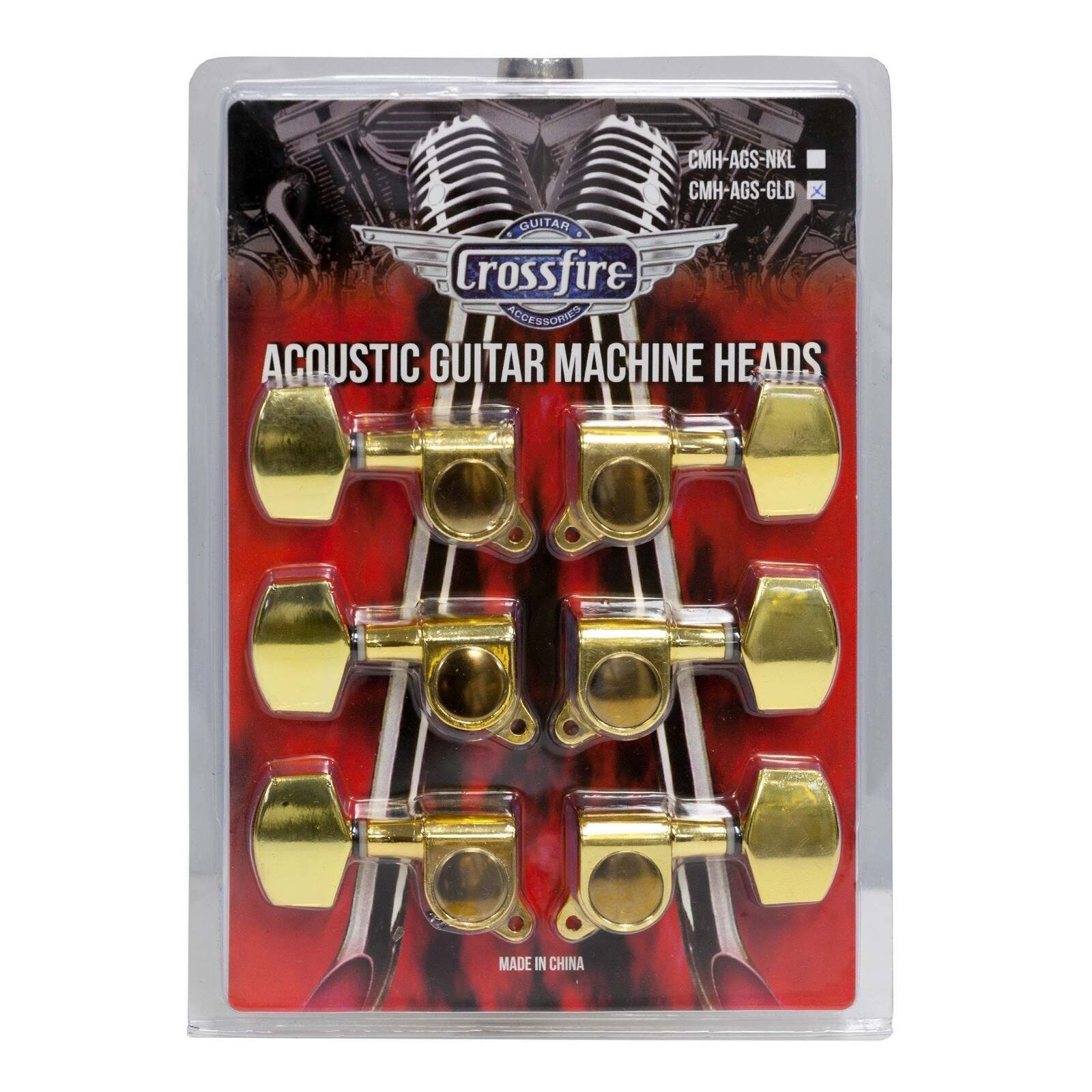 The Crossfire CMH-AGS-GLD Machine Head Set features six (3-a-side) diecast, gold plated tuners, suited for a variety of acoustic guitars.