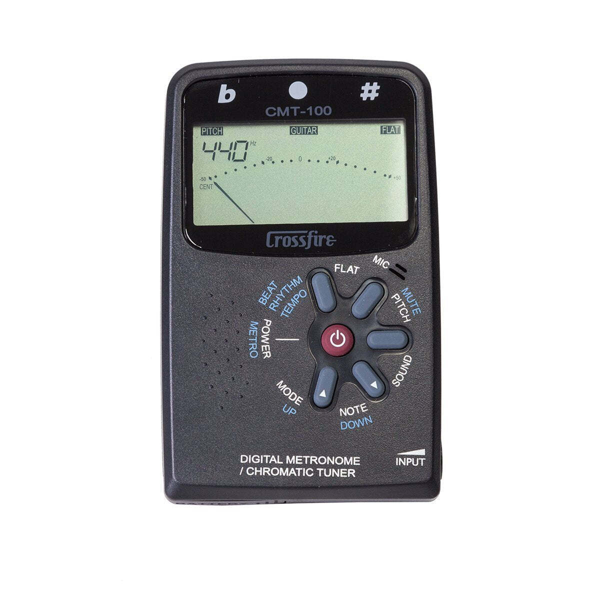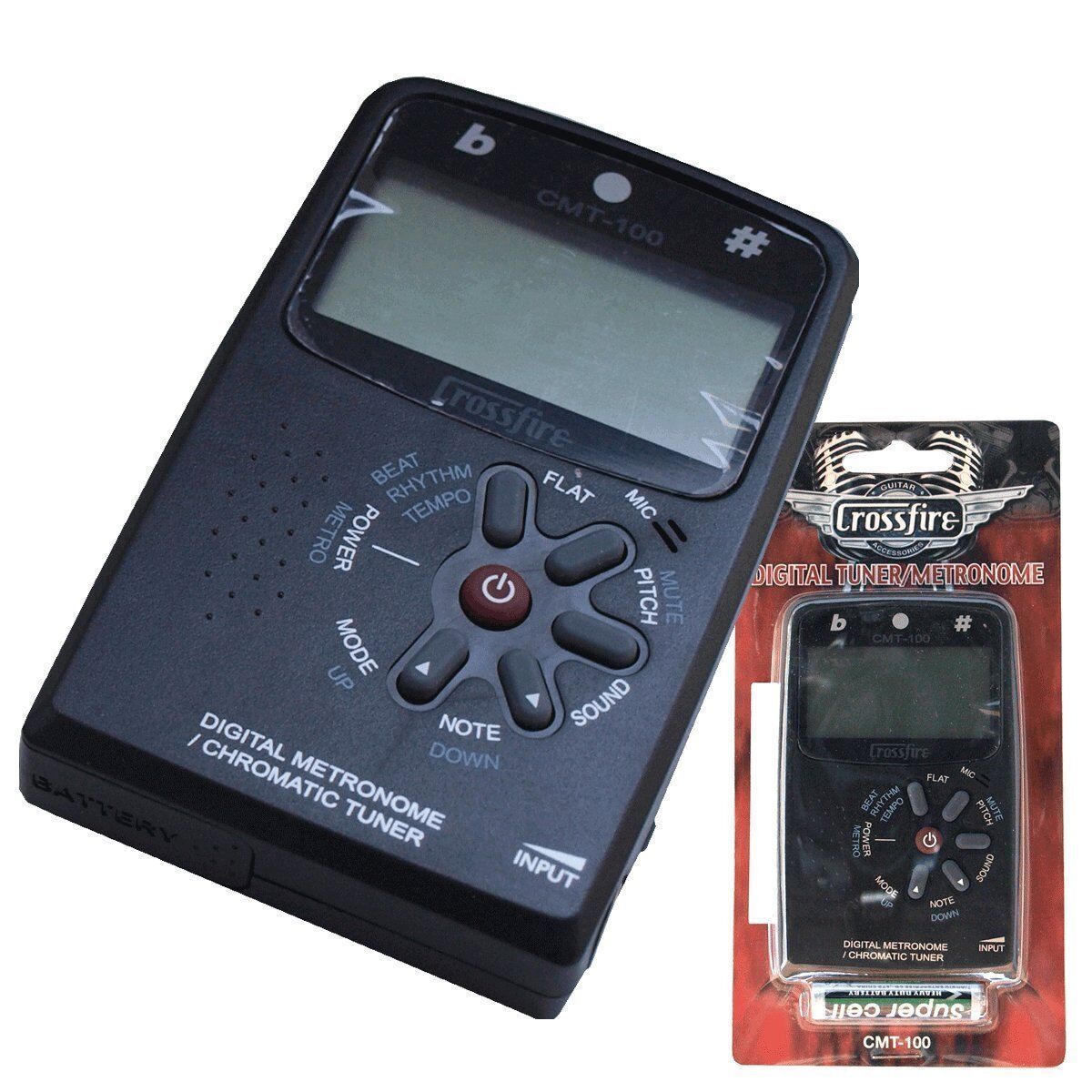 This is our popular Crossfire CMT-100-BLK Digital Metronome and Chromatic Tuner . Suitable for Acoustic, Electric and Bass Guitar tuning using plug-in socket or built-in mic. Powered by two ‘AAA’ batteries (included). This model is Black and is also available in white.