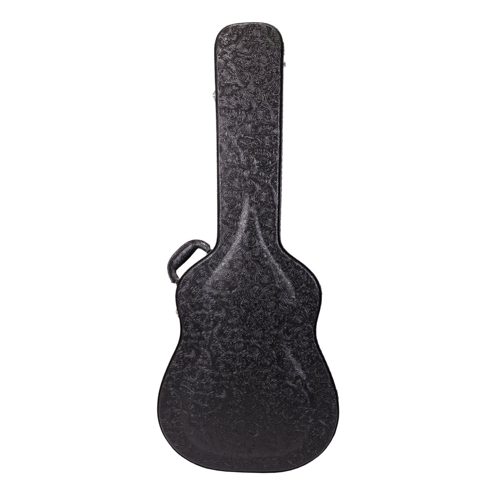 Travel in style while keeping your musical investment secure with the Crossfire deluxe dreadnought acoustic guitar case. Features heavy duty plywood construction with impact resistant reinforced arched top, paisley patterned black vinyl exterior covering, dark forest-green plush padded interior, deluxe padded carry handle, accessories compartment, metal feet on base and back, as well as chrome latches (central latch is lockable). Please check the case dimensions provided to ensure your instruments correct fit. *Guitar not included.