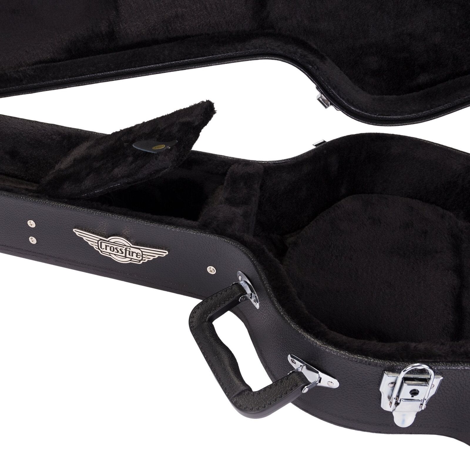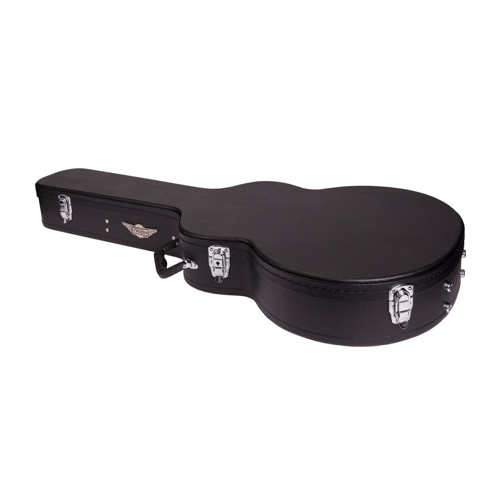 Keep your musical investment secure with the Crossfire standard shaped 335 style case. Features heavy duty plywood construction, black vinyl exterior covering, black plush padded interior, moulded plastic carry handle, accessories compartment, metal feet on base and back, as well as chrome latches (central latch is lockable). Please check the case dimensions provided to ensure your instruments correct fit. *Guitar not included.