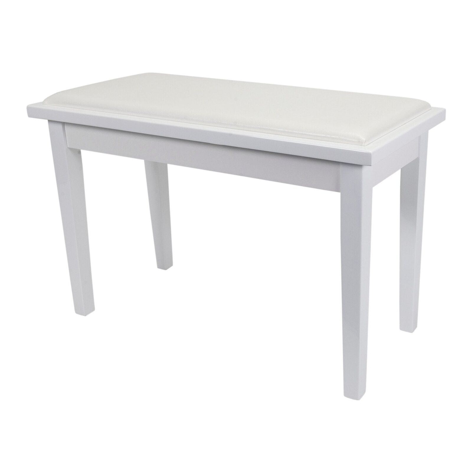 The Crown CPS-1-WHT features a soft faux leather seat, a sturdy wood frame and an under-seat storage compartment. Simple assembly required. Features: Duet stool comfortably seats two players. Stylish timber trim design. Storage compartment under stool. So
