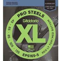 EPS165-5 is the 5-string version of the most popular DAddario hybrid bass set which combines the high strings from an EPS170 (.45 and .65) with the low strings from an EPS160 (.85 and .105). With the addition of the .135 Low B string, this set is optimal for players looking for the ideal combination of biting high end, punchy lows and super long life. Fits basses with a string scale length of up to 36 1/4 inches.