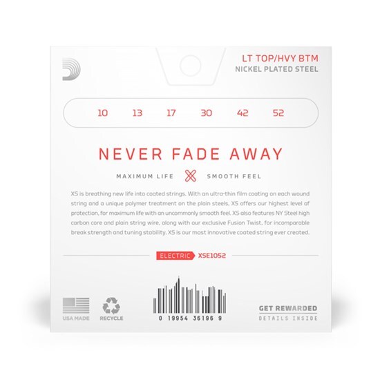 XS Nickel coated electric guitar strings provide the longest life of any D’Addario electric guitar string. Coated with groundbreaking XS coating, these premium electric strings attain maximum life and a smooth, fast feel without dampening their outstanding tone. Constructed with a NY Steel core, reformulated nickel-plated steel wrap wire, and Fusion Twist technology, XS Nickel strings boast superior strength and tuning stability, plus richer harmonics, greater clarity, and remarkable definition with every sweep, slide, and bend. This 10-52 Light Top/Heavy Bottom gauge set has a deeper low-end than Regular Lights, balanced with comfortable playability.