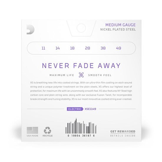 Product Information   11-49   XS Nickel coated electric guitar strings provide the longest life of any D’Addario electric guitar string. Coated with our groundbreaking XS coating, these premium electric strings attain maximum life and a smooth, fast feel without dampening their outstanding tone. Constructed with a NY Steel core, reformulated nickel-plated steel wrap wire, and Fusion Twist technology, XS Nickel strings boast superior strength and tuning stability, plus richer harmonics, greater clarity, and remarkable definition with every sweep, slide, and bend. This 11-49 Medium gauge set provides increased volume, with slightly more tension and resistance.
