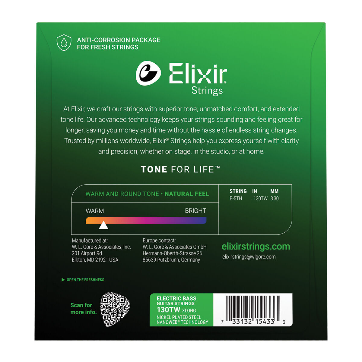 Elixir 15433 Nanoweb Single Bass Medium B .130TW XLong Nickel Plated Steel Strings
