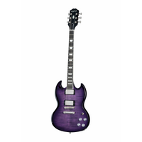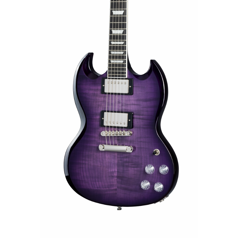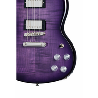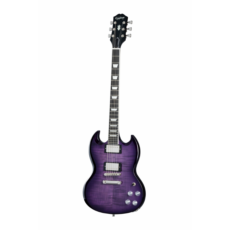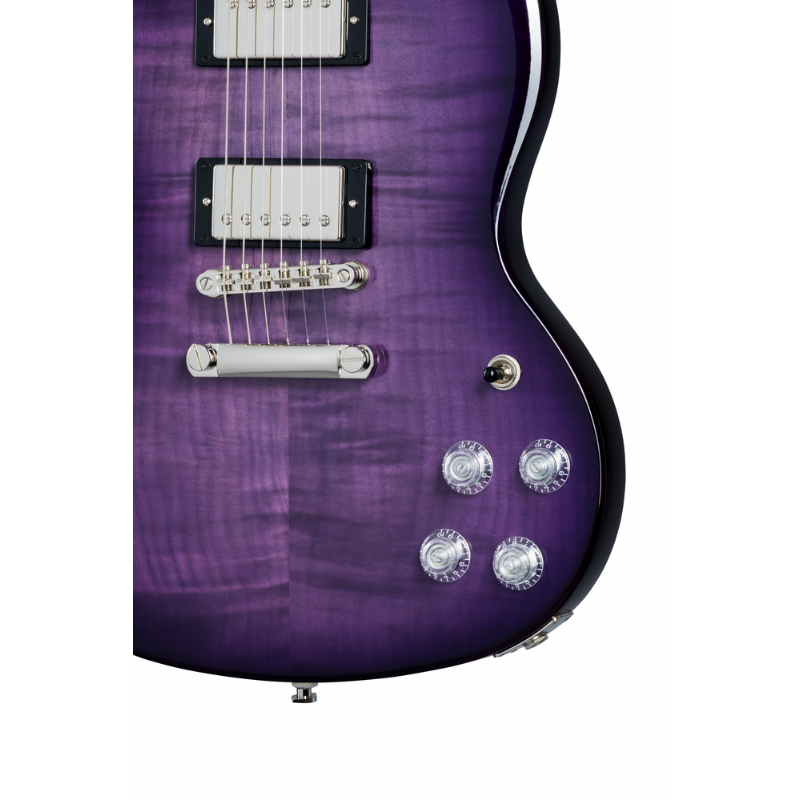 The SG Modern Figured from Epiphone’s Inspired by Gibson™ Collection has the classic SG™ body profile made from mahogany and a 3/4” maple cap with an AAA-figured maple veneer