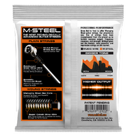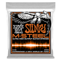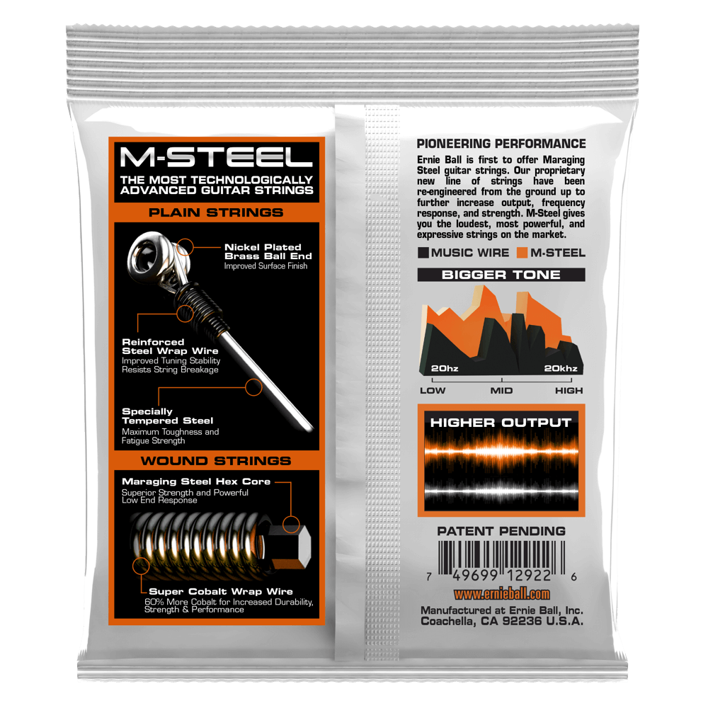 Ernie Ball M-Steel Electric Guitar Strings are made of a patented super cobalt alloy wrapped around a maraging steel hex core wire, producing a richer and fuller tone with a powerful low-end response. M-Steel plain electric guitar strings are comprised of a specially tempered steel for maximum fatigue resistance. The electric plain strings also utilize a patented winding of steel around the ball end that reduces slippage, breakage and stays in tune better than conventional plain strings. Gauges: 0.09, 0.011, 0.016, 0.026, 0.036, 0.046.
