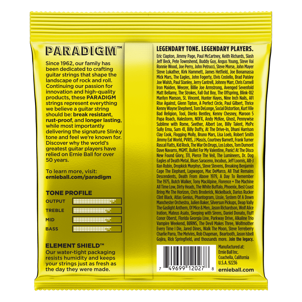 The Ernie Ball Beefy Slinky Paradigm Electric Guitar Strings provide unprecedented strength and longer life while retaining 100 percent slinky tone and feel. Ultra-high strength steel is included in both the wound and plain strings along with a patented reinforcement at the ball end twist of each plain string to provide superior tensile and fatigue strength for strings that lock into tune fast and hold up under the most stressful playing styles and conditions. The coupling of Ernie Ball's Everlast nano treatment with breakthrough plasma enhanced wrap wire provides added corrosion resistance and reduced accumulation of tone-robbing build-up and debris.