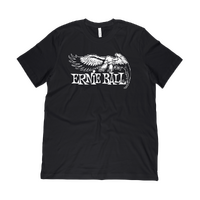 The classic Ernie Ball Eagle logo from our iconic Slinky string packs. Screen printed white ink on black poly cotton jersey t-shirt. 65% polyester, 35% combed ring-spun cotton, 3.5oz fabric.