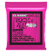Ernie Ball Slinky Classic Rock N Roll Pure Nickel wrap electric guitar strings are made from pure nickel wire wrapped around tin plated hex shaped steel core wire, these guitar strings produce a warm rich tone with that signature Slinky feel. Gauges .009, .011, .016, .024w, .032, .042.