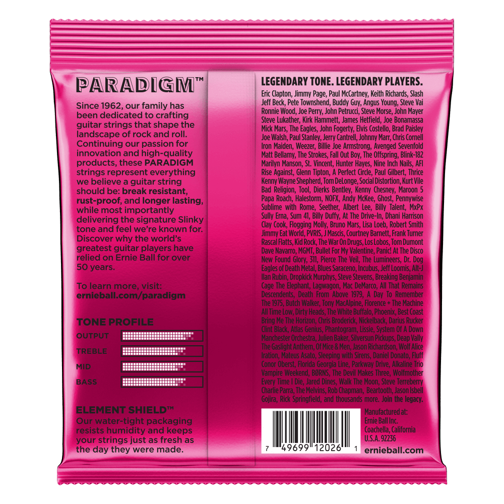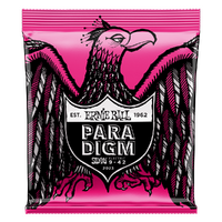 Ernie Ball Slinky Paradigm Electric guitar strings provide unprecedented strength and longer life while retaining 100 percent Slinky tone and feel. Ernie Ball's industry-leading ultra-high-strength steel is included in both the wound and plain strings along with a patented reinforcement at the ball end twist of each plain string to provide superior tensile and fatigue strength for strings that lock into tune fast and hold up under the most stressful playing styles and conditions. The coupling of Ernie Ball's Everlast nano treatment with breakthrough plasma enhanced wrap wire provides added corrosion resistance and reduced accumulation of tone-robbing build-up and debris. Experience the first set of longer lasting strings that are worth playing with all benefits and no compromises. .009, .011, .016, .024w, .032, .042.