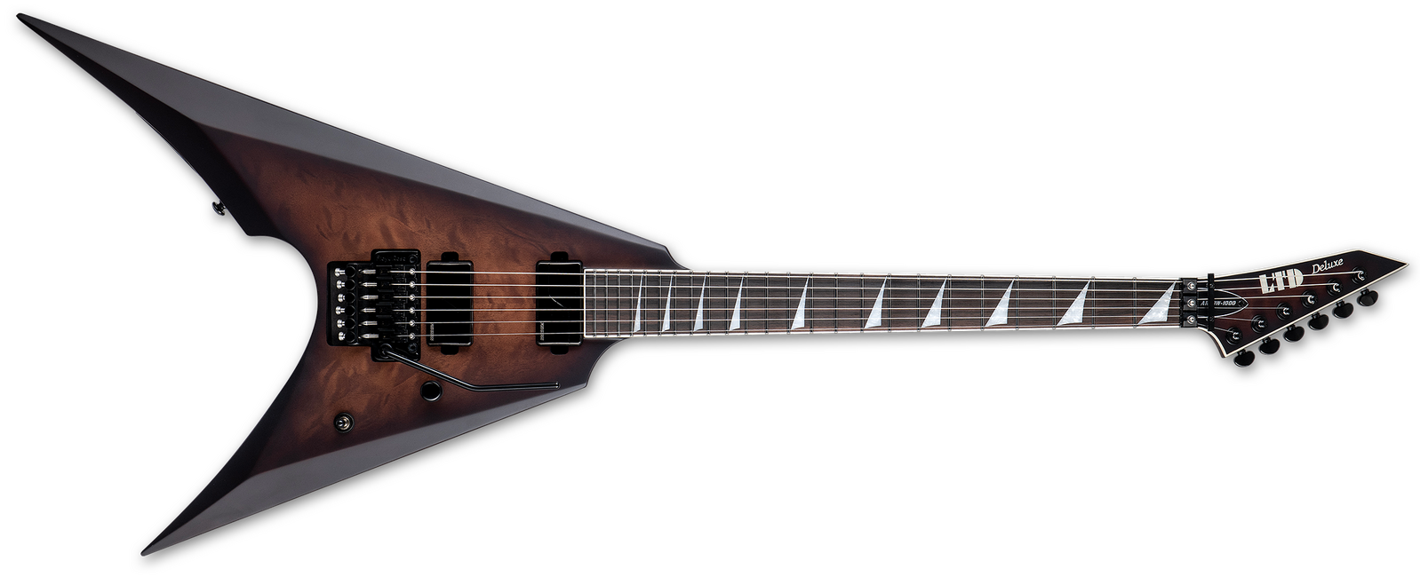 With its beveled body and completely unique V shape, this Arrow-1000 stands out from the crowd with its figured quilted maple top, looking superb in Dark Brown Sunburst Satin finish. It features neck-thru-body construction at 25.5” scale with a mahogany body. Its extra-thin u-shaped three-piece maple neck has a compound radius for improved playing comfort, and features a reverse headstock with matching finish, Macassar ebony fingerboard with triangular white pearloid inlays, and 24 extra-jumbo stainless steel frets. The Arrow-1000 includes a set of direct-mount Fishman Fluence Modern Humbucker active pickups (ceramic in the bridge and alnico in the neck), with push-pull control to select voicings and black nickel covers to match this guitar’s outstanding aesthetics. Each pickup offers two voices. With the ceramic bridge pickup, Voice 1 is the ultimate high-output ceramic humbucker bridge pickup tone… crisp, searing crunch, tight bass with no mud, and a growl. Voice 2 delivers modern passive attack performance that has superbly organic distortion characteristics with outstanding dynamics and response. The alnico neck pickup’s Voice 1 is Fishman’s modern active high-output tone, offering the ideal active alnico sound: full, round, and boosted, but with unprecedented articulation and dynamics. Voice 2 gives you the crisp, clean and fluid neck humbucker tone you’ve always wanted. Other components on the Arrow-1000 include a Floyd Rose 1000SE bridge with stainless steel screws and precise Grover tuners.