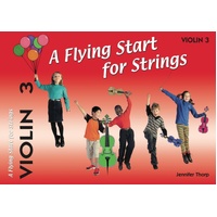 Book 3 introduces more complex tunes within an octave. It further explores intervals across adjacent strings and introduces semiquavers, staccato bowing, low second finger notes and major scales and arpeggios starting on the third finger (cello fourth finger). More duets, canons and rounds extend experience in ensemble playing. Simple harmonics and tunes in 6/8 are included. A bowing variations page has new rhythms and bowings. A Flying Start for Strings - Violin 3 Composer: Jennifer Thorp Publisher: Flying Strings Instrument: Violin Pages: 1 Series: Flying Start
