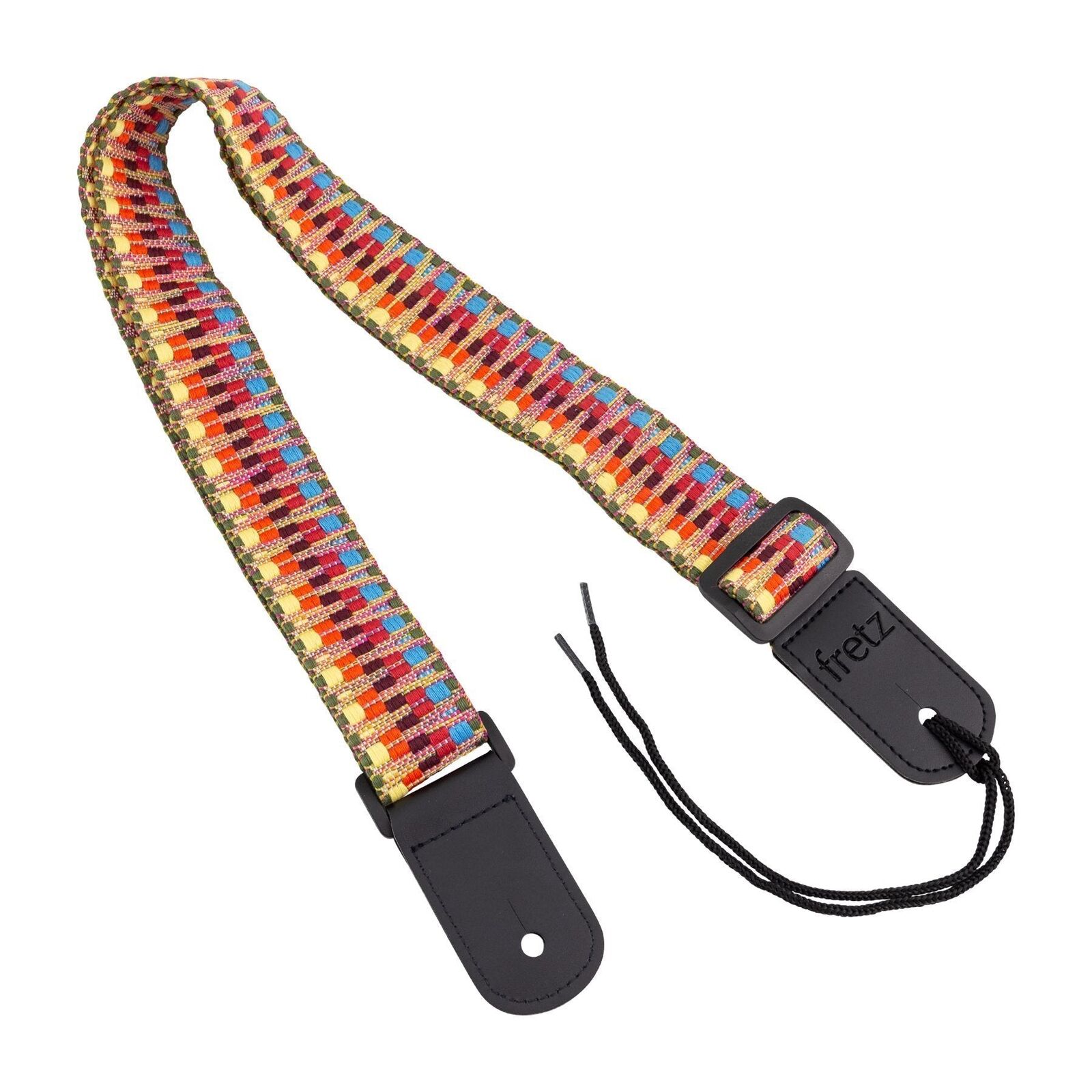 The Fretz FUST-JRW43 Ukulele Strap features a comfortable 1.5" wide woven jacquard patterned strap with microfiber leather ends that can be easily adjusted up to 47" in length.