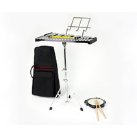 The Maxtone Percussion #13061 Percussion Kit is a perfect learning tool for the beginning percussionist. 2-1/2-octave (32 Note) bell set includes 8″ tuneable practice pad, folding tripod stand to hold the glockenspiel or a practice pad, music rack, glockenspiel mallets, and drumsticks in a soft-sided backpack-style carry bag.