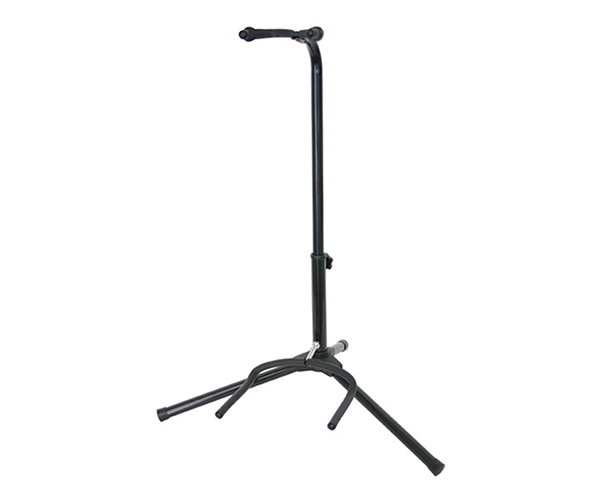 Black Guitar Stand. Adjustable tripod with rocker and sturdy tubular metal frame. Protective rubber on all contact points. Taiwan.