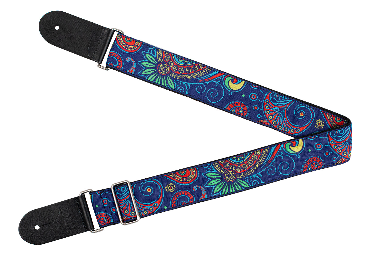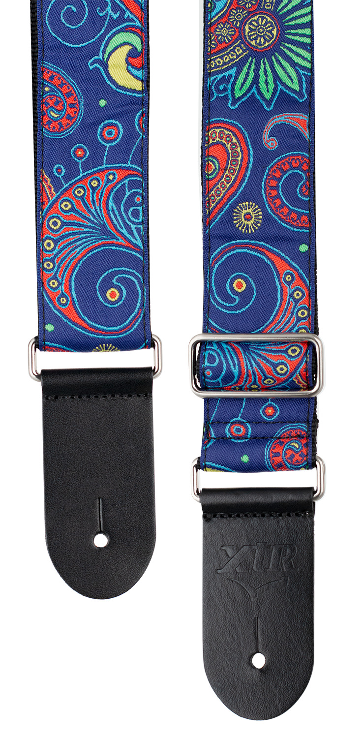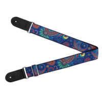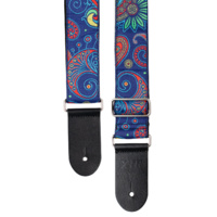 2 inch deluxe woven jacquard poly cotton strap with comfortable, two-layer black poly backing. Premium black leather ends, smooth chrome slider adjustment. Vintage paisley blue.