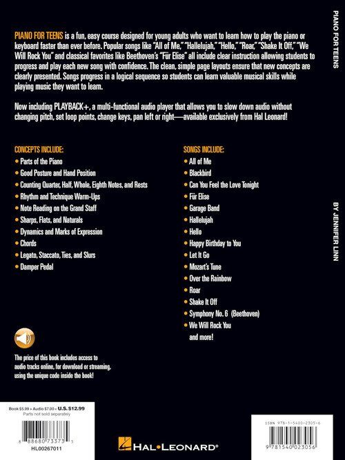Piano for Teens is a fun, easy course designed for young adults who want to learn how to play the piano or keyboard faster than ever before. Popular songs like “All of Me,” “Hallelujah,” “Hello,” “Roar,” “Shake It Off,” “We Will Rock You” and classical favorites like Beethoven's “Für Elise” all include clear instruction allowing students to progress and play each new song with confidence. The clean, simple page layouts ensure that new concepts are clearly presented. Songs progress in a logical sequence so students can learn valuable musical skills while playing music they want to learn. Hal Leonard Piano for Teens Method Publisher: Hal Leonard Instrument: Piano Pages: 48