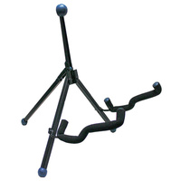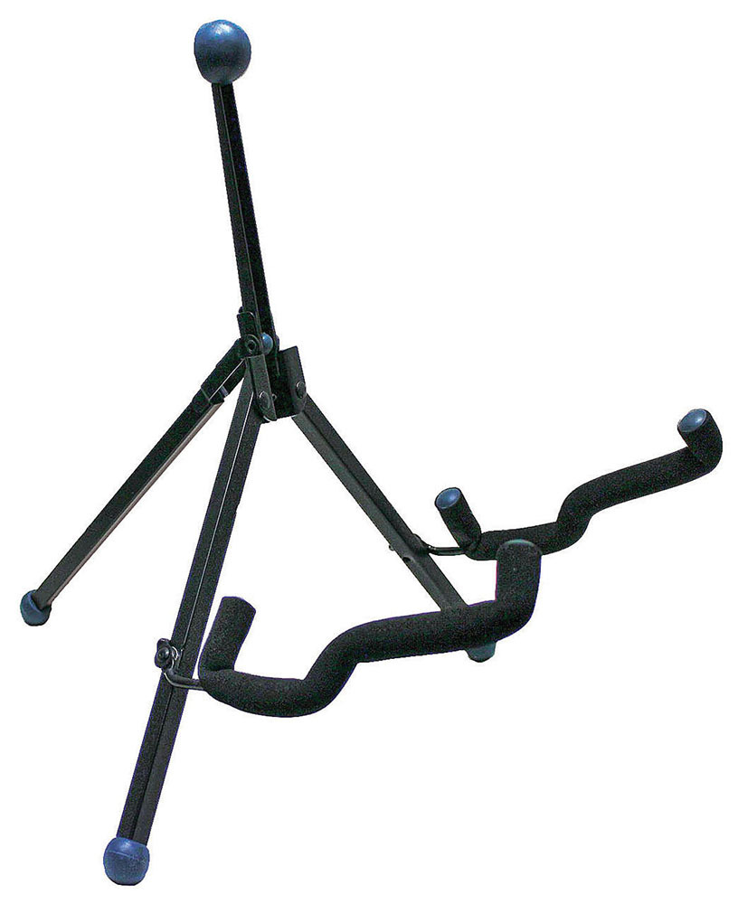 Tech Specs - The Stage PRO KB3500G Super Guitar Stand has three legs and a hinged back support which allows it to fold to a small size for transport and storage, easily fitting into most any gig bag. The back support cushion is a larger spherical shape and made from a soft rubber. This material is safe for all types of finishes and has an attractive look. The feet are made from the same thermoplastic rubber as the back cushion and are also spherically shaped. All metal parts of the stand are finished with a durable black powder coating.