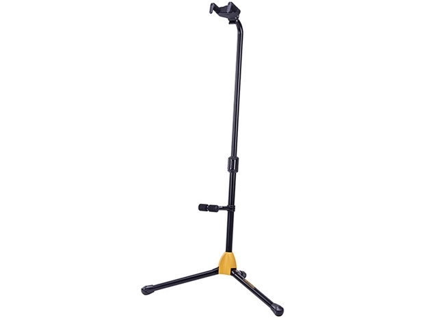 The HERCULES Guitar Stand GS412B features the Auto Grip System (AGS) yoke the Comfort Grip Specially Formulated Foam (SFF) rubber on all contact points and the adjustable back rest. SPECIFICATIONS:The built-in Auto Grip System safely locks instrument in place.The Comfort Grip with Locking Pin adjusts stand height quickly easily and securely.The Folding Back Rest supports instrument securely has multi-angle position adjustment and folds up securely for travel.Specially Formulated Rubber Foam fully protects instrument at all contact points.