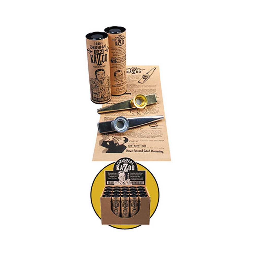 Manufactured in Tinplate finished in Gold colour with integral threaded cap and neck for easy tuning and membrane replacement. The quality of the sound is very much dependant on the standard of the player, if you can sing or hum in tune – then you can play the Kazoo. A Kazoo is a member of the ‘Membranophone’ musical classification which is in the percussion instruments as the sound is created through a stretched membrane.