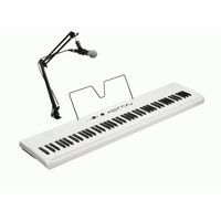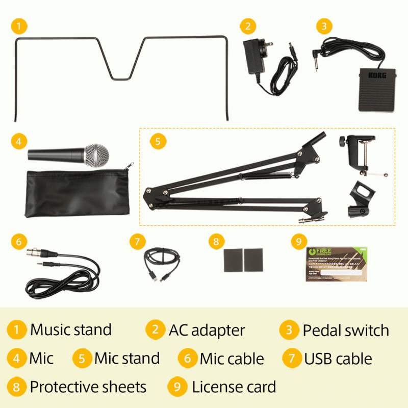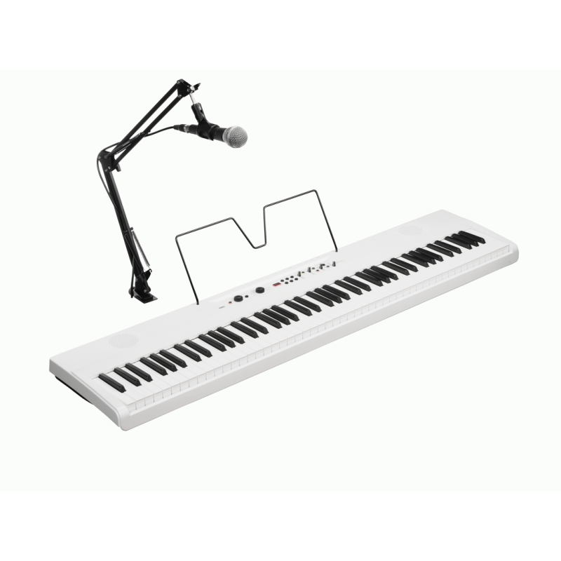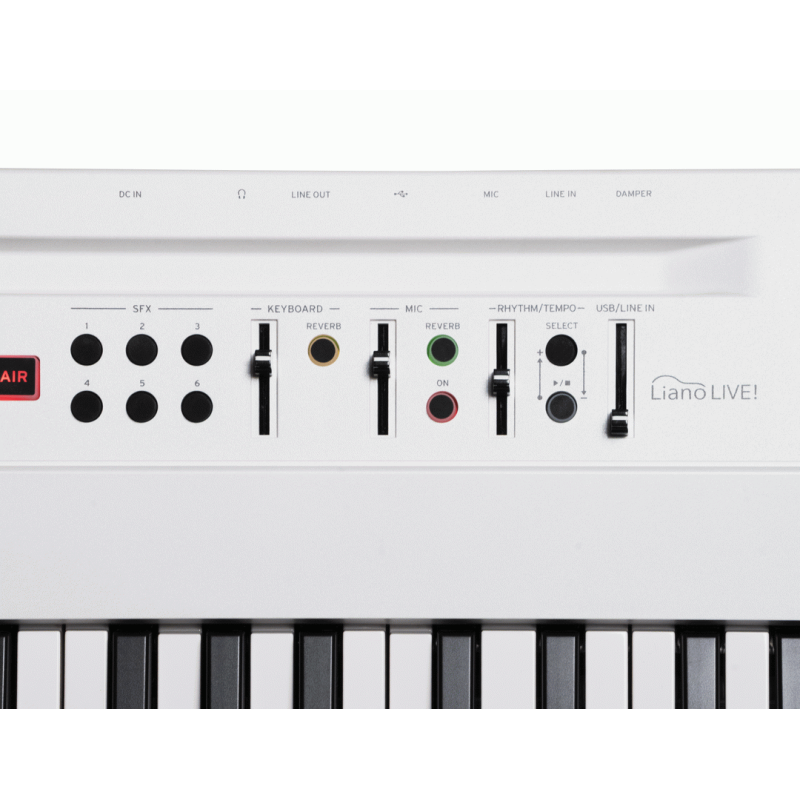 Liano LIVE! is an all-in-one digital piano that includes everything needed to start livestreaming — a microphone, mic stand, mic cable, USB-C cable, and a built-in audio mixer integrated directly into the piano.